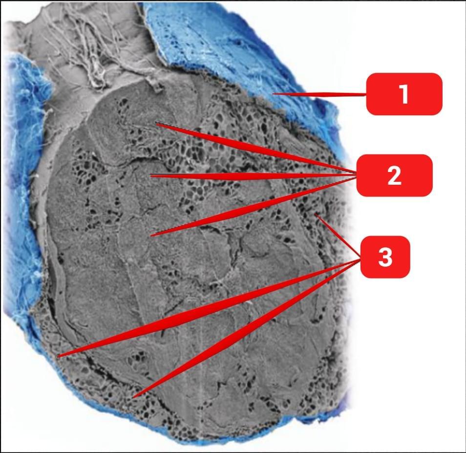 A imagem abaixo foi obtida por microscopia eletrônica de um nervo tibial humano. O entendimento mais profundo dessa anatomia tem facilitado o conhecimento sobre os mecanismos e consequências das lesões nervosas periféricas. Conhecendo essas estruturas, qual afirmação é correta?