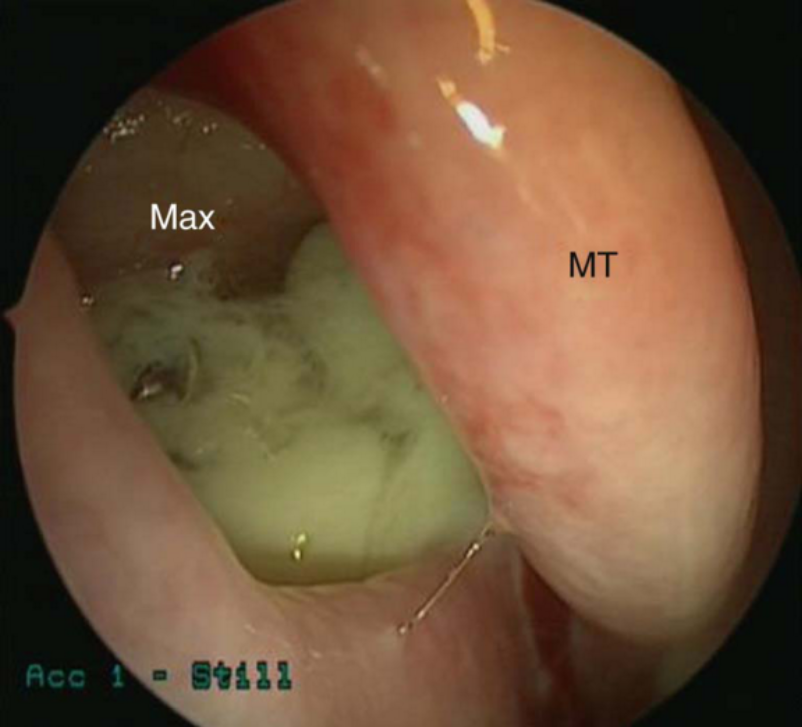 A fungus ball (mycetoma) is a collection of inspissated fungal debris and mucus in an isolated paranasal sinus. Symptoms are similar to CRS or patients can occasionally be asymptomatic. The maxillary sinus is the most common location. Characteristic CT appearance is a heterogeneous hyperdensity within a sinus with microcalcifications. Intraoperatively, fungal balls appearing as a mass of thick, crumbly debris and fungal hyphae are often appreciable. Treatment is endoscopic removal, and antifungal medications are not typically required.