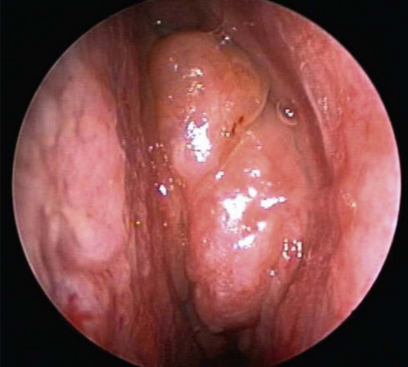 Endoscopic signs include nasal polyps , mucopurulent discharge (primarily from the middle meatus), and mucosal edema (also primarily in the middle meatus). CT findings include mucosal thickening of the paranasal sinuses and osteomeatal complex and fluid or debris in the paranasal sinuses (opacification).