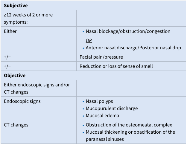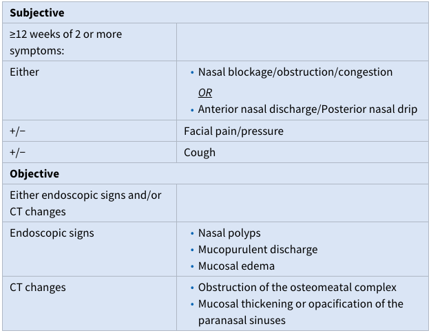 CRS is chronic inflammation of the mucosal lining of the paranasal sinuses that persists for at least 12 weeks. Clinically, rhinosinusitis is defined by clinical symptoms (subjective) plus suggestive endoscopic and/or CT changes (objective)