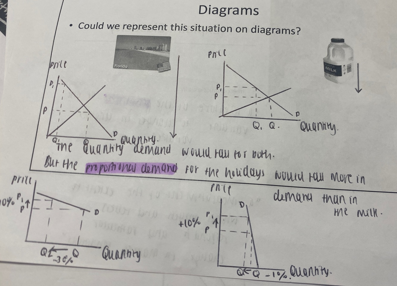 The quantity demand would fall for both. However the proportional change in demand for the holidays will fall more in demand than in the milk.