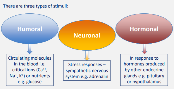 What are the 3 stimuli for endocrine glands/cells to release their hormones?