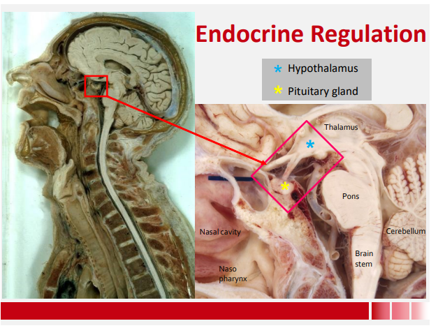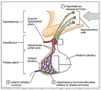 1) Hypothalamus releases hormone through the stock that targets the pituitary gland cells e.g TRH (Thyrotropin releasing hormone)