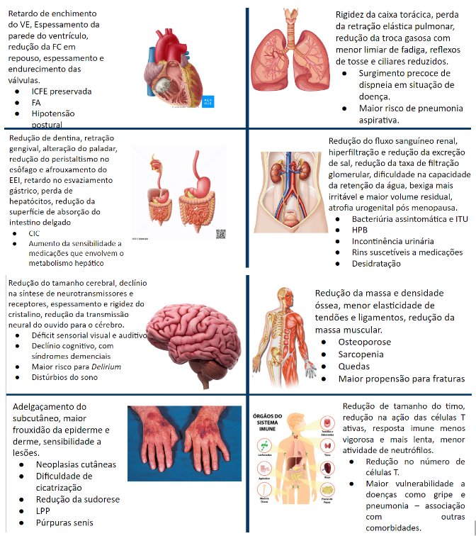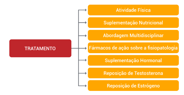 perda de massa muscular e aumento da proporção de massa gordurosa; aumento de tecido fibroconectivo em diversos órgãos; desmineralização óssea.
