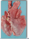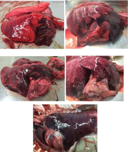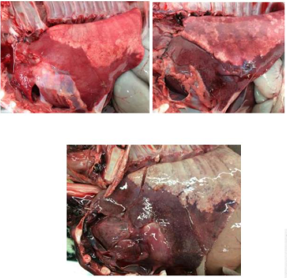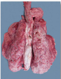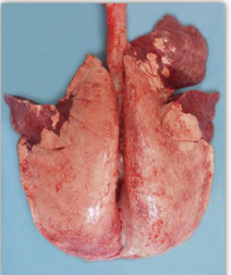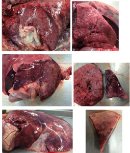 * Carcass: small white foci with areas of purple heavy lung
