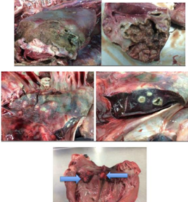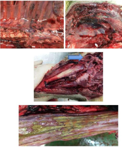 * Carcass features: haemorrhage all over, enlarged throat lymph nodes (blue arrow), defects/reddening/green-beige deposit on lining of oesophagus