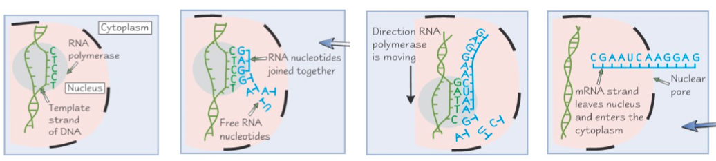 When does the RNA polymerase stop making mRNA and detachs from DNA in transcription?