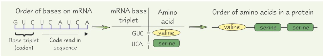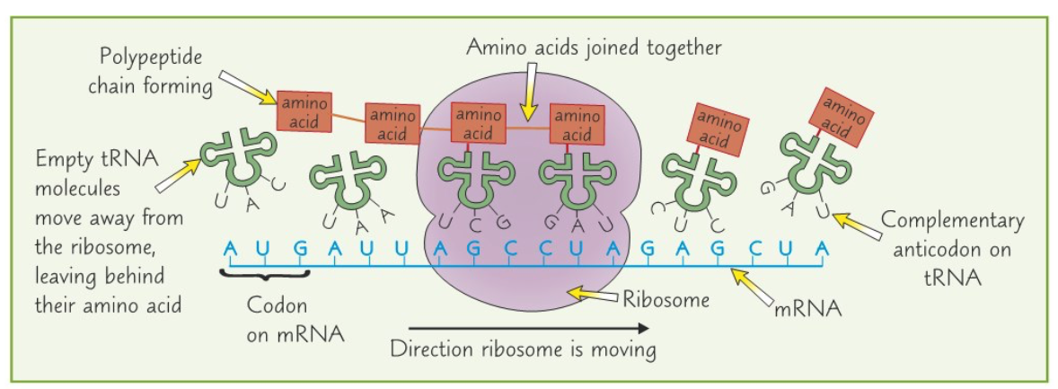 Amino acids are joined together to make polypeptide chain, following the sequence of codons (triplets) carried by mRNA