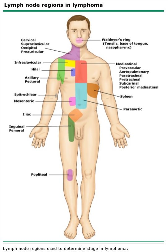 [UpToDate: The Ann Arbor staging system with Cotswolds modifications is the current staging system used for patients with HL. While further revisions have been proposed at a meeting in Lugano (ie, the Lugano classification), the proposed revisions are controversial and not widely accepted. Patients are staged using information from a clinical examination and imaging studies. They are placed into one of four stages, based upon the sites of involvement, and are assigned numbers and letters that designate the number of lymph node regions involved and the presence or absence of systemic symptoms or of bulky or extended disease. For these purposes, the tonsils, Waldeyer’s ring, and spleen are considered nodal tissue.