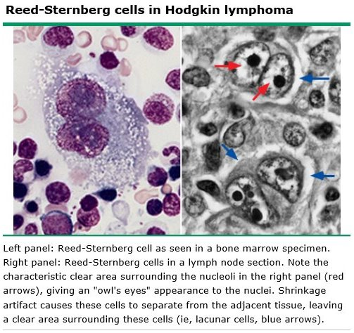 [UpToDate: Hodgkin lymphoma (HL), formerly called Hodgkin’s disease, arises from germinal center or post-germinal center B cells. HL has a unique cellular composition, containing a minority of neoplastic cells (Reed-Sternberg cells and their variants) in an inflammatory background. It is separated from the other B cell lymphomas based on its unique clinicopathologic features, and can be divided into two major sub-groups, based on the appearance and immunophenotype of the tumor cells: