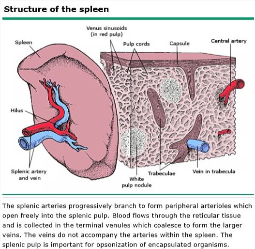 [The white pulp is the major site of bacterial clearance that lacks preexisting antibodies. It is the site of removal of poorly opsonized bacteria, particles, and cellular debris. It is the site of antigen processing with interaction between macrophages and helper T cells.]