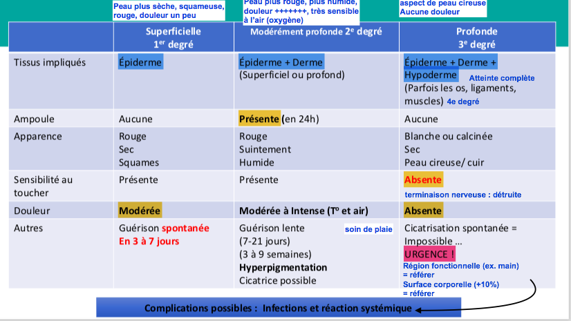 (Tissus impliqués, ampoule, apparence, sensibilité au toucher, douleur, autres(guérison))