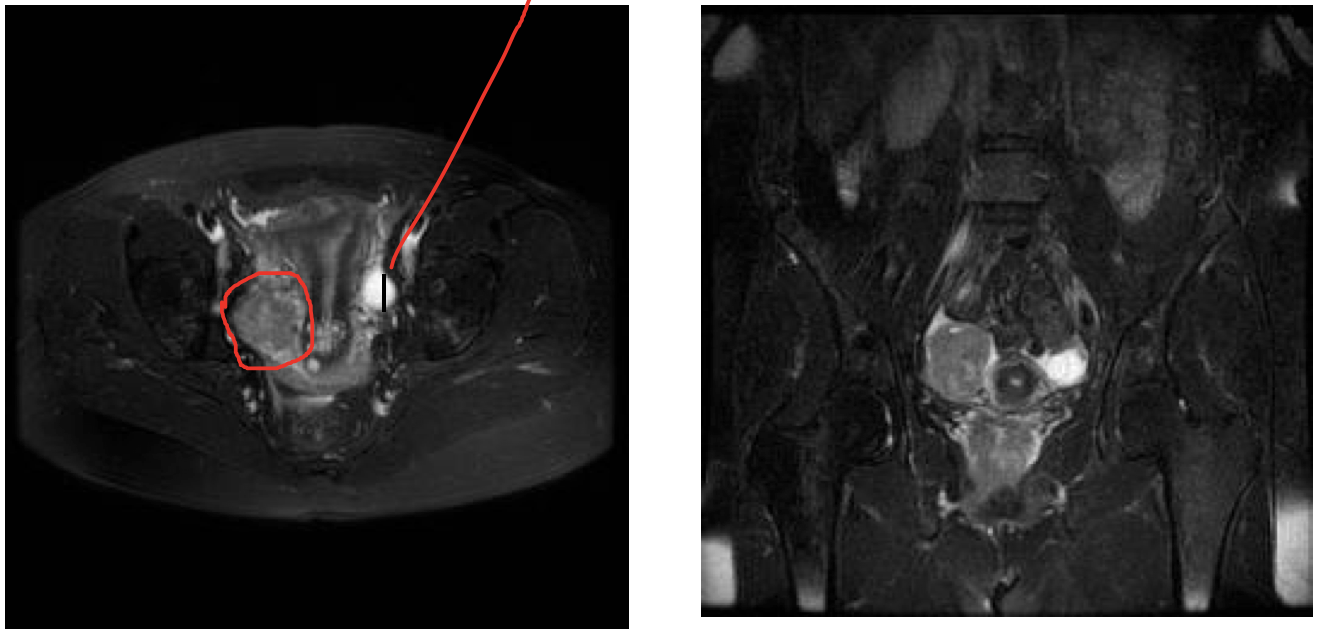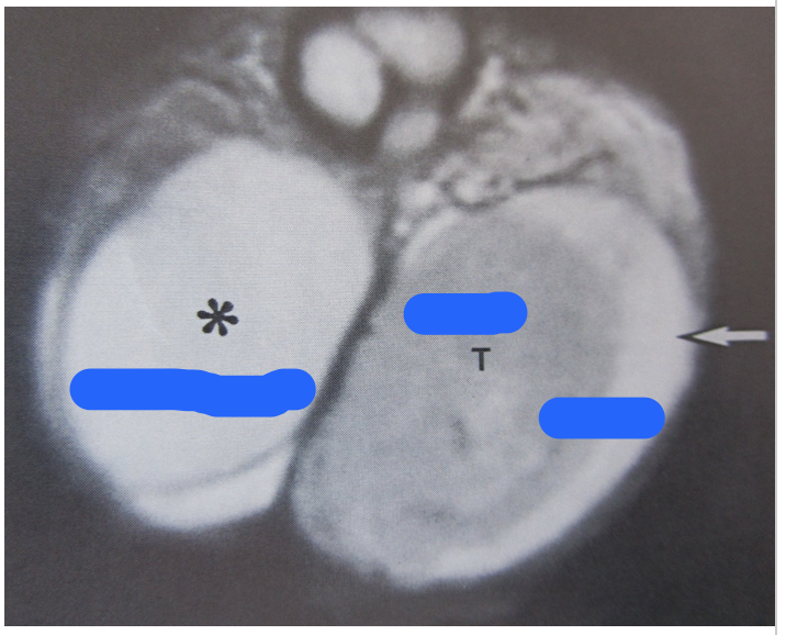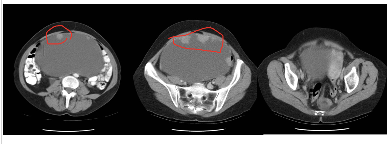 Cystadenocarcinoma (tissue density changes circled in red help in identification)