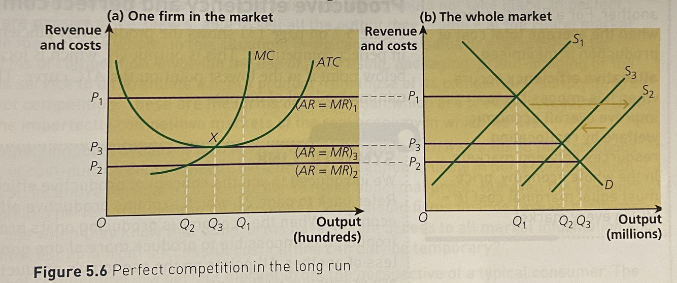 Initially, too many firms enter the market, causing supply to shift to S2. This causes ATC to be above AR meaning firms are making subnormal profit. This causes firms to leave the market so supply shifts to S3 at which point the ATC = AR meaning all firms are making normal profit at the ruling market price.