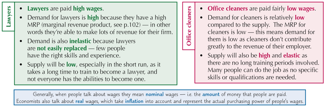 Wages will probably be higher if demand is high and inelastic, and supply is low and elastic. Wages tend to be low when demand is low and elastic, and supply is high and elastic.