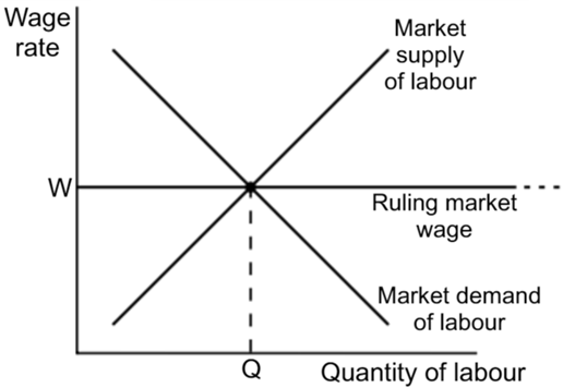 In the whole labour market, the market wage (W) is determined by demand and supply.