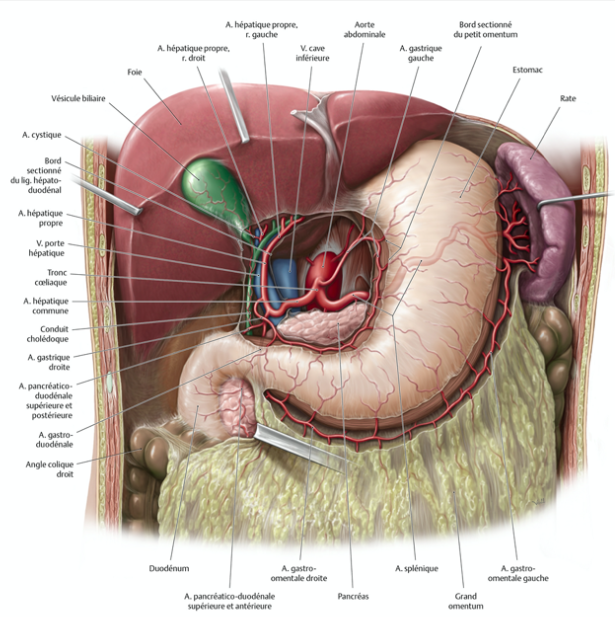 Qu’est-ce qui passent dans le bord libre du petit omentum (lig. hépato-duodénal) ?
