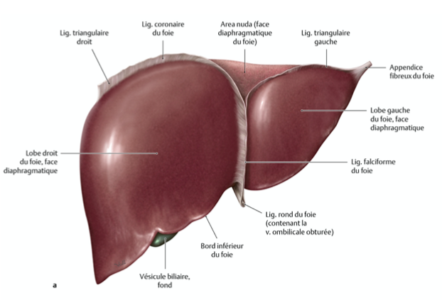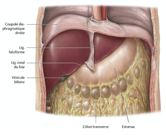 ○ le lobe droit, le plus grand, à droite du ligament falciforme