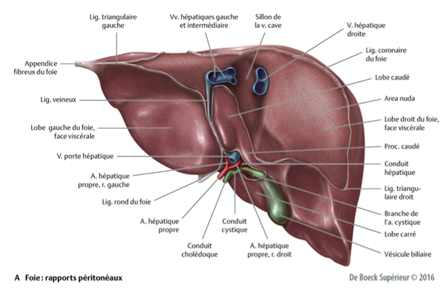 L’area nuda fait exception; les vv. hépatiques (le plus svt au nombre de 3) quittent le foie à cet endroit pour rejoindre la v. cave inférieure.