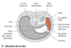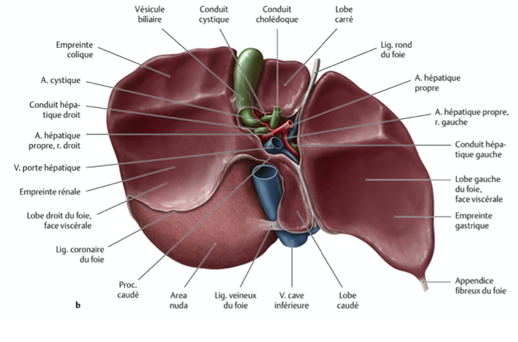 ○ le lobe carré, sur la face viscérale, entre la vésicule biliaire et le lobe gauche