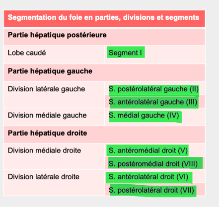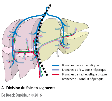 Le foie se divise en 8 segments: les vaisseaux afférents (a. hépatique propre, v. porte hépatique) et les voies efférentes (vv. hépatiques, conduit hépatique commun) ont la même segmentation de leurs branches