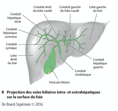 ● Les voies biliaires émergent de chaque lobe sous forme d’un canal hépatique droit ou gauche.