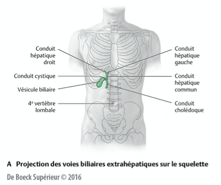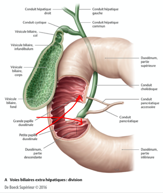 ● L’abouchement du conduit cholédoque (le plus svt avec le conduit pancréatique dans la grande papille duodénale) est situé à la hauteur de L2.