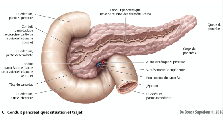 Le long de la glande chemine le canal pancréatique principal (de **Wirsung) dans lequel se jettent les canalicules glandulaires. Il se termine dans l’ampoule hépato-pancréatique** et dans la grande papille duodénale.