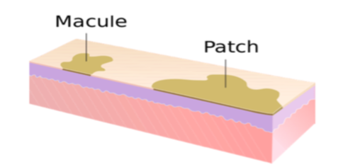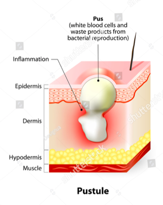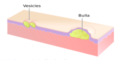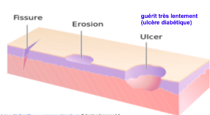QSJ : Contour défini, mais souvent irrégulier, perte focale de l’épiderme et du derme. Croûte exsudat séché.