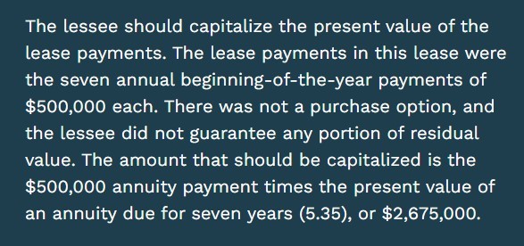 Koby Co. entered into a finance lease with a vendor for equipment on January 2 for seven years. The equipment has no guaranteed residual value. The lease required Koby to pay $500,000 annually on January 2, beginning with the current year. The present value of an annuity due factor for seven years was 5.35 at the commencement of the lease. What amount should Koby capitalize as leased equipment?