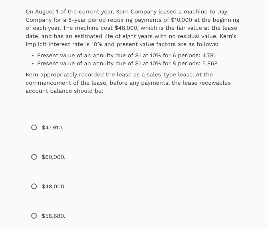 When a lessor is recognizing a lease transaction as a sales-type lease, the lessor creates an account for the net investment in the lease which is comprised of the lease receivable and any unguaranteed residual value. This account keeps track of the lease rental payments to be received by the lessor. Here the net investment in the lease balance at the beginning of the lease is all six payments of $10,000 multiplied by 4.791, or $47,910