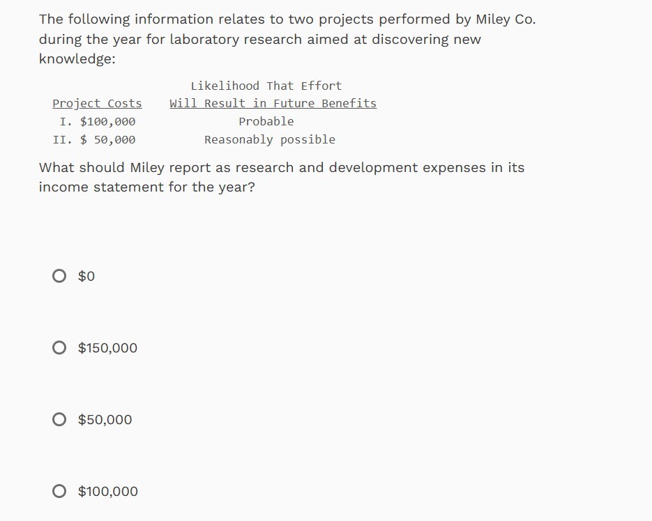 R&D (research and development) should be expensed if doubt exists as to whether any future benefits will be received, so both projects should be expensed. Miley should report $150,000 ($100,000 + $50,000) as R&D expense in its income statement for the year.