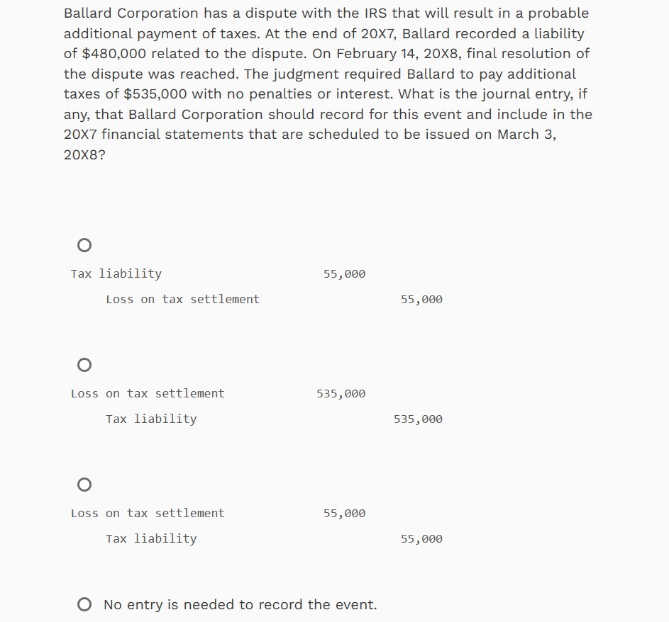 Because the amount of tax Ballard must pay increased, an additional loss of $55,000 ($535,000 − $480,000) needs to be recorded along with an additional liability of $55,000. Additional information about this event should also be disclosed in the notes to the financial statements.
