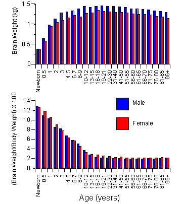 In humans the brain continues to grow at the foetal rate for two years after birth (Bogin 1997). By 3 year of age it is at 80% adult capacity and 90% by five years of age (Dekaban & Sadowsky 1978)