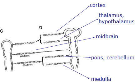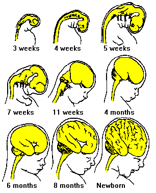 After the first five weeks, the brain’s gross features are formed by growth and flexion (or bending) of the neural tube’s anterior (front) portions. The result is a cerebral cortex that envelops the subcortical and brainstem structures that started out in line with the cortex along the neural tube. The final gross structural form are the product of continued cortical enlargement and folding.