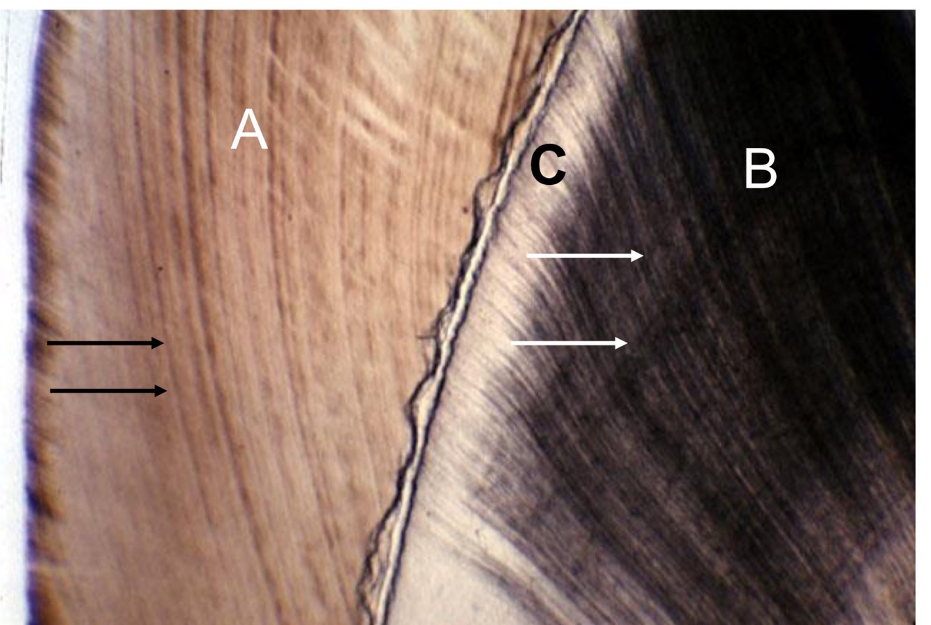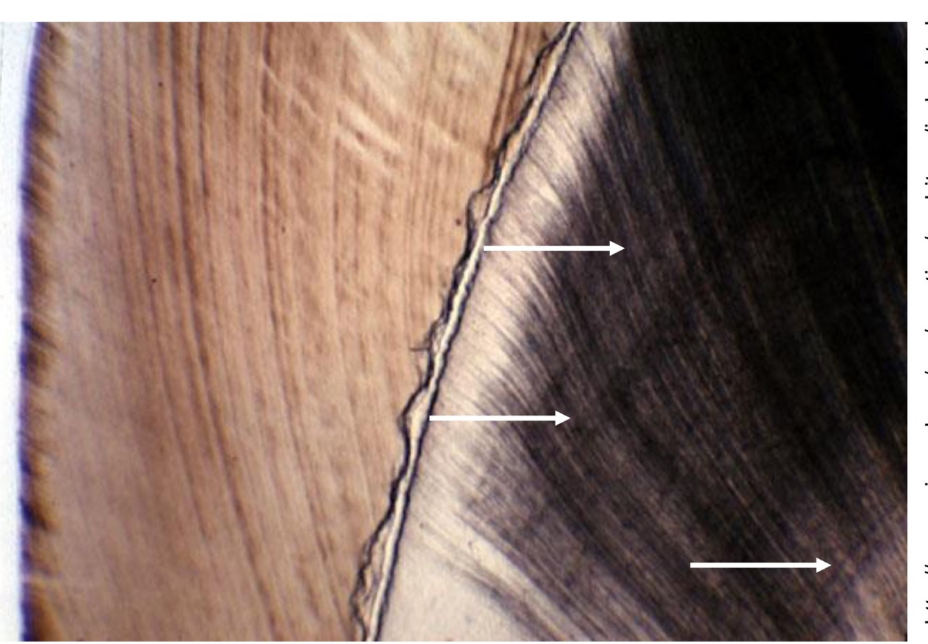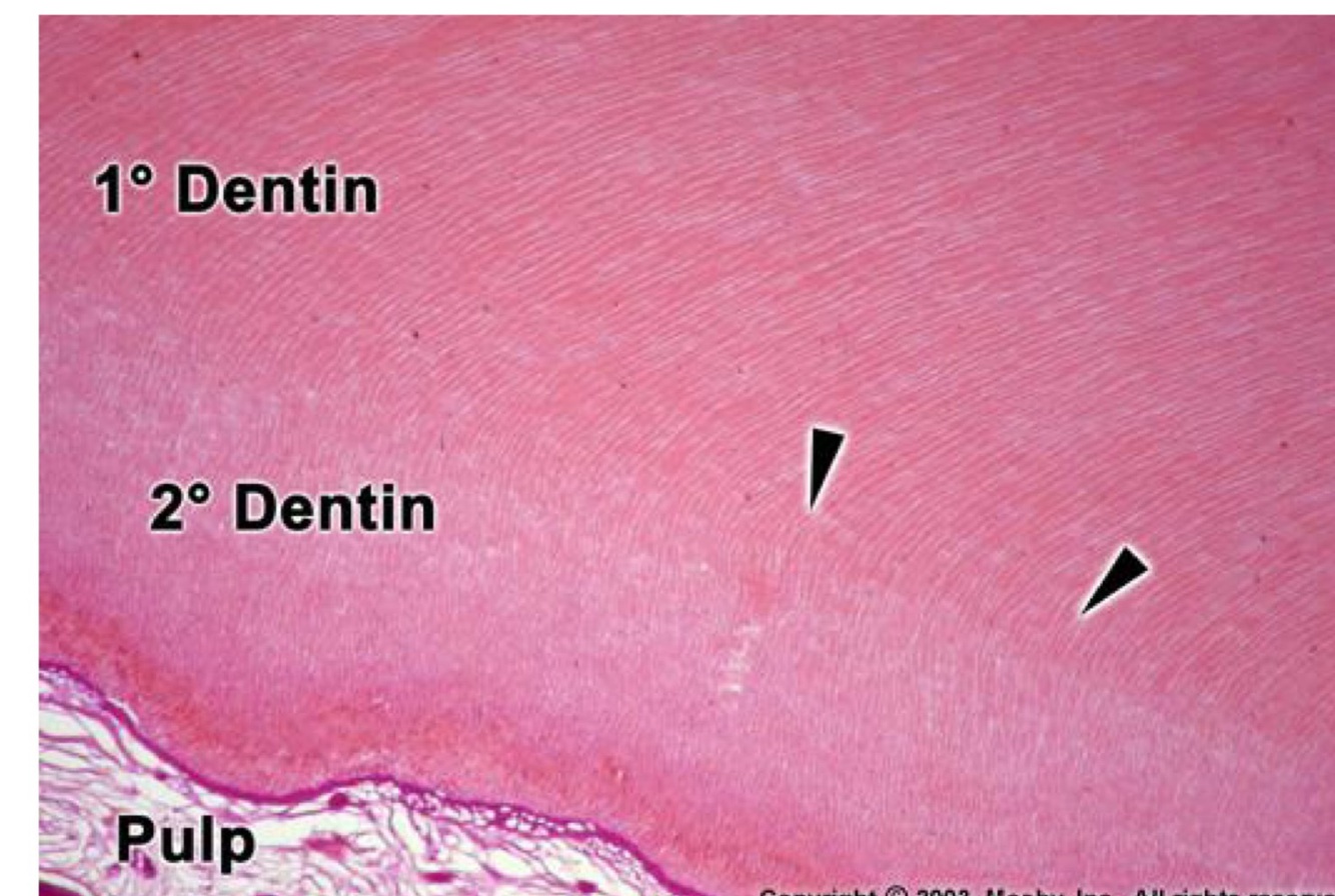What happens to the direction of the dentinal tubules in secondary dentin?