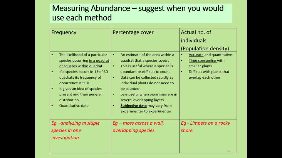 Used to make species comparisons in different areas of habitat e.g. north and south facing