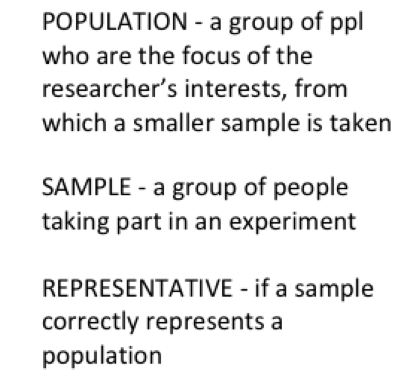 POPULATION - a group of ppl who are the focus of the researcher’s interests, from which a smaller sample is taken