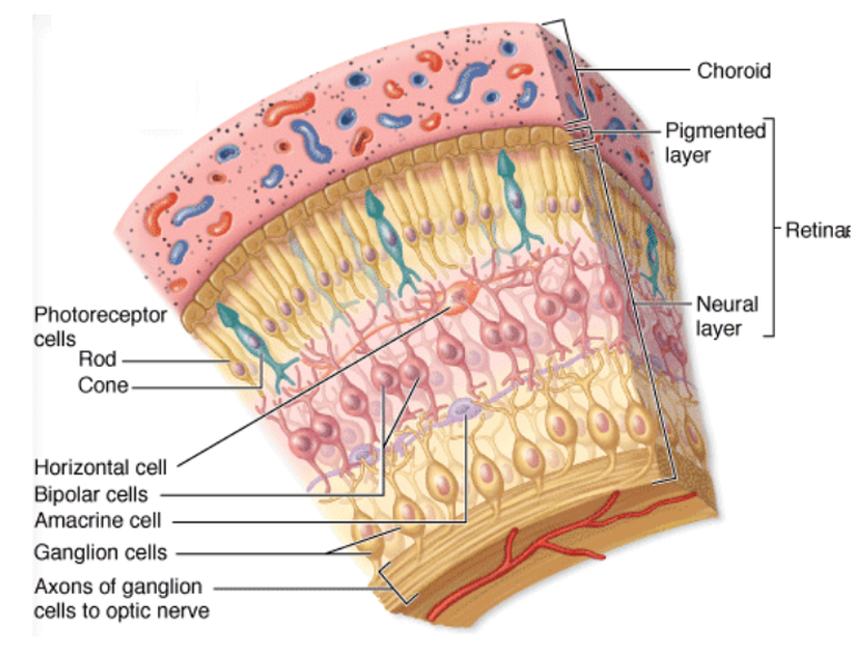 describe how impulses are spread from photoreceptor cells to the optic nerve
