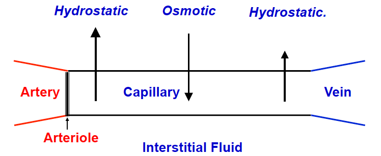 1) Movement of fluids in or out of capillaries across capillary length 2) Tends to leak out at arterial end 3) Tends to enter at venous end 4) Excess fluid is removed by lymphatics