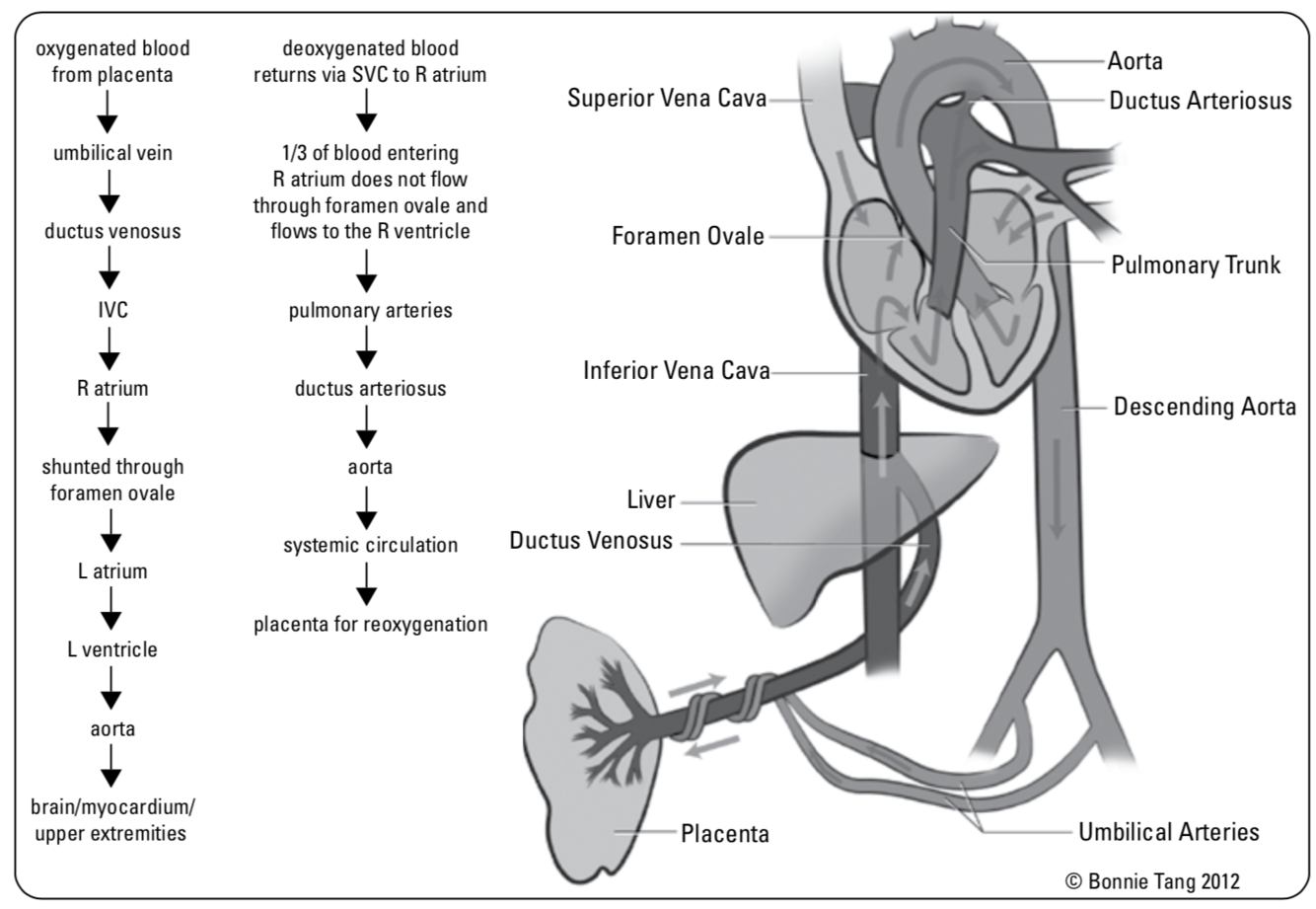 Fetal circulation is designed so that oxygenated blood is preferentially delivered where? (2)