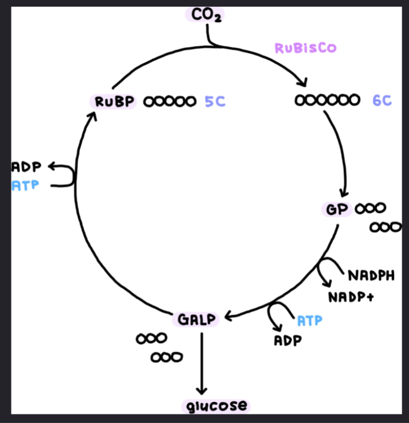• CO2 combines with a 5C compound called ribulose bisphosphate (RuBP) to form a 6C compound, which quickly splits into two 3C molecules of glycerate 3-phosphate (GP).