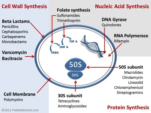 Which 3 antibiotics or classes of antibiotics work by inhibiting the 50s ribosome and protein synthesis?