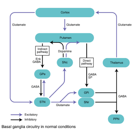 Tremor- unclear (may be due to dysfunction of indirect pathway supressing unwated movements)
