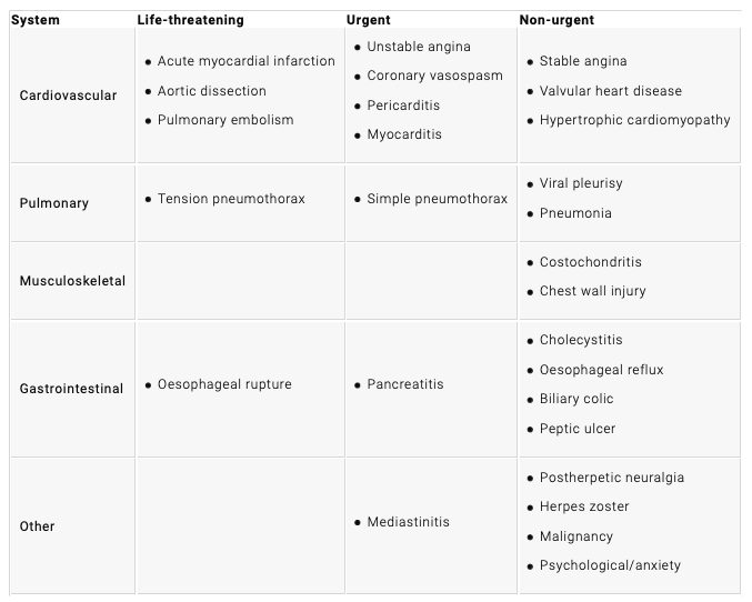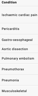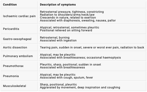 How will the following causes of chest pain present?
