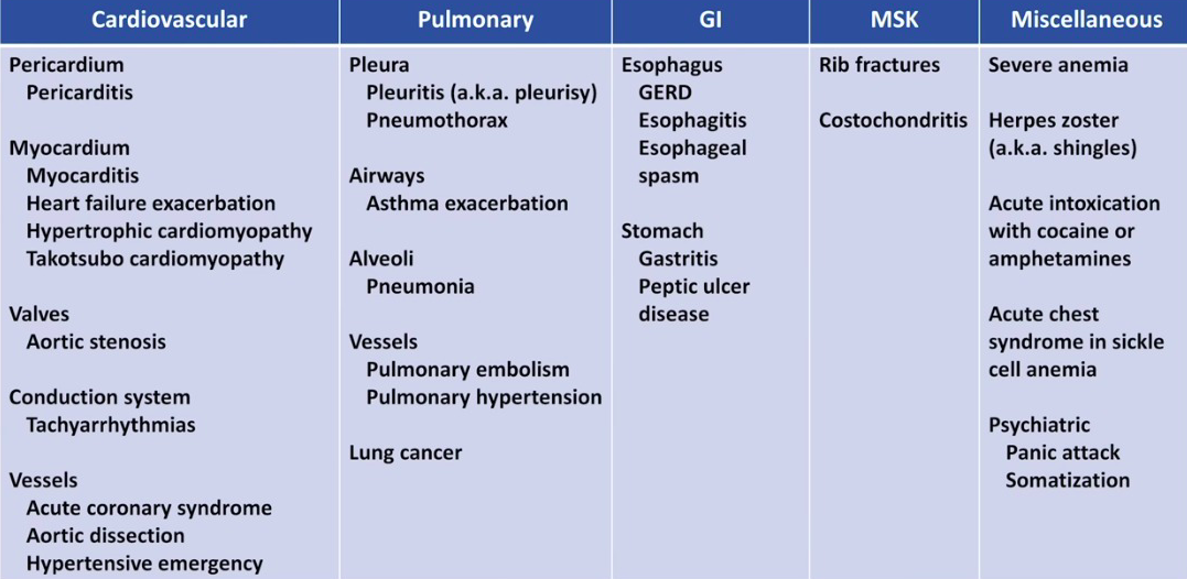 Once you have ruled out life threatening differentials, what are some other causes of chest pain that may present to ED?