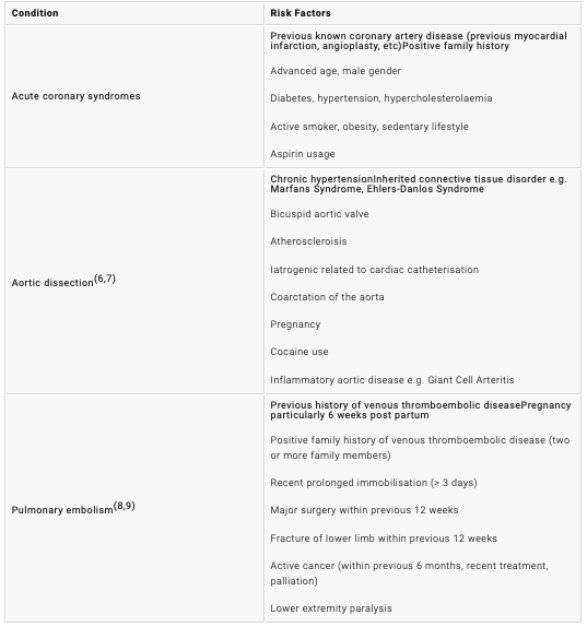 What are some risk factors you need to enquire about in the history of a patient with acute chest pain as it could mean they are more likely to have an ACS, aortic dissection or PE?