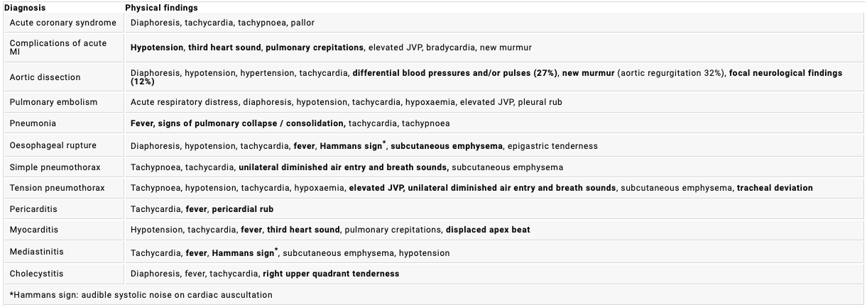 What signs may be found on examination of a patient with acute chest pain and the following diagnosis (especially aortic dissection and MI)