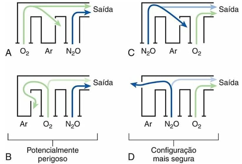 A sequência de fluxômetros é uma causa potencial de hipóxia. Observe que em situações de vazamento, caso o oxigênio não seja o último gás da linha, pode haver escape desse gás pelo vazamento e sua concentração final pode acabar sendo muito baixa.