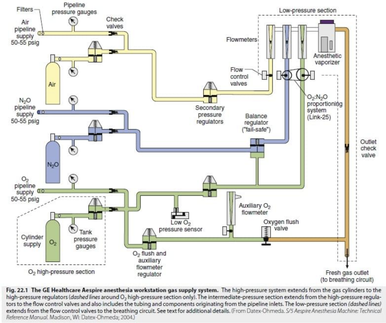 É comum que os aparelhos de anestesia sejam equipados com as duas opções. Uma chave seletora dirige o fluxo dos gases para a saída interna ou para externa.